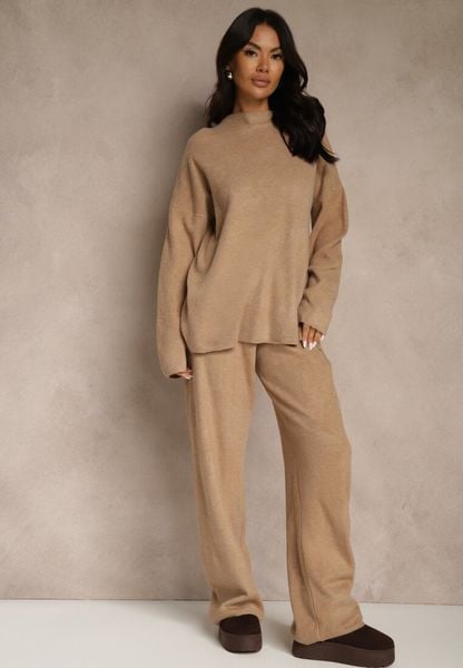 Ciemnobeżowy Dzianinowy Komplet z Wełną w Warkoczowy Splot Spodnie i Sweter Reinette