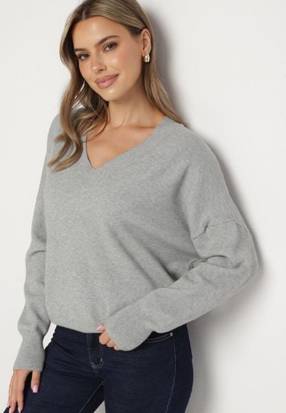 Szary Sweter z Dekoltem w V z Domieszką Kaszmiru Mariara