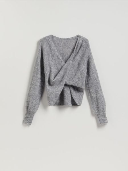 Sweter o swobodnym kroju, wykonany z dzianiny z wełną i dodatkiem moheru.