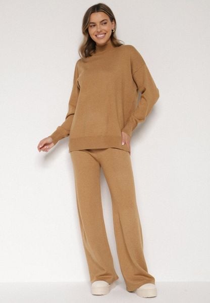Beżowy Dzianinowy Komplet z Wełną Sweter z Półgolfem i Szerokie Spodnie Lanerra