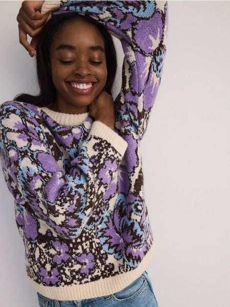 Sweter o prostym kroju, wykonany z miękkiej dzianiny.