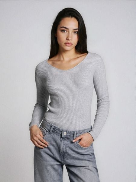 Sinsay – Prążkowany sweter z dekoltem V – szary –