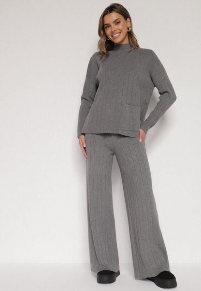 Szary Prążkowany Komplet Dzianinowy Szerokie Spodnie i Sweter z Półgolfem Fenitiva
