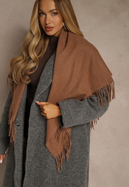 Jasnobrązowy Bawełniano-Wiskozowy Szalik w Kształcie Trójkąta z Frędzlami Vetisara