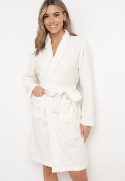 Klasyczny szlafrok Limanne z pluszowej, prążkowanej dzianiny. W talii wiązany paskiem. Na wysokości bioder posiada naszyte wsuwane kieszenie. To świetny wybór na chłodne jesienno-zimowe wieczory.
