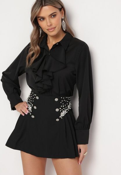 Czarne Szorty Spódnica z Ukrytym Suwakiem Ozdobione Cyrkoniami Perłami oraz Guzikami Nelile