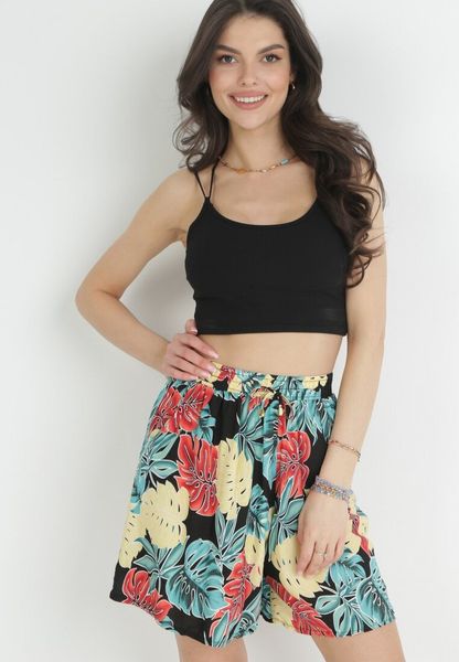 Spodnie z krótką, szeroką nogawką i regularnym stanem. W pasie wszyta gumka i sznureczek. Wykonane z kwiecistego materiału z zawartością wiskozy.