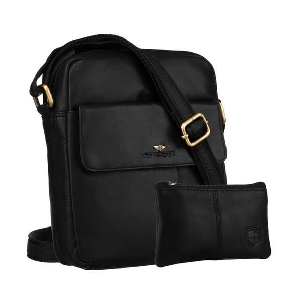 Stylowa torba męska Peterson ze skóry naturalnej w czarnym kolorze. Przestronna, z regulowanym paskiem, kieszeniami na suwak i wysoką trwałością. Idealna do przechowywania najważniejszych rzeczy na co dzień.