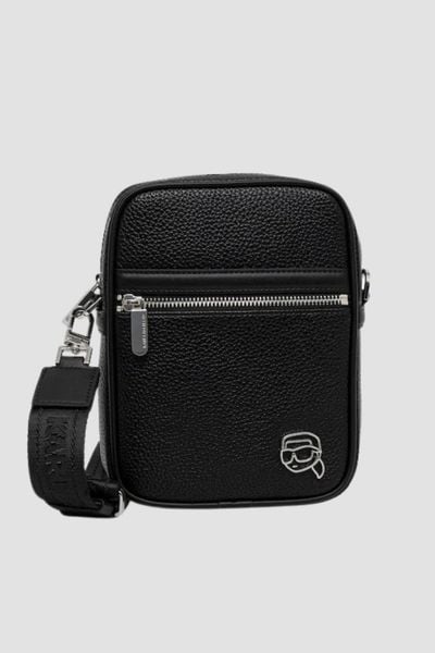 KARL LAGERFELD Czarna saszetka Ikon Outline Crossbody to kompaktowy model o nowoczesnym designie, ozdobiony charakterystycznym logo Ikon. Praktyczna forma i regulowany pasek sprawiają, że idealnie sprawdzi się na co dzień, łącząc wygodę z wyrafinowanym stylem marki.