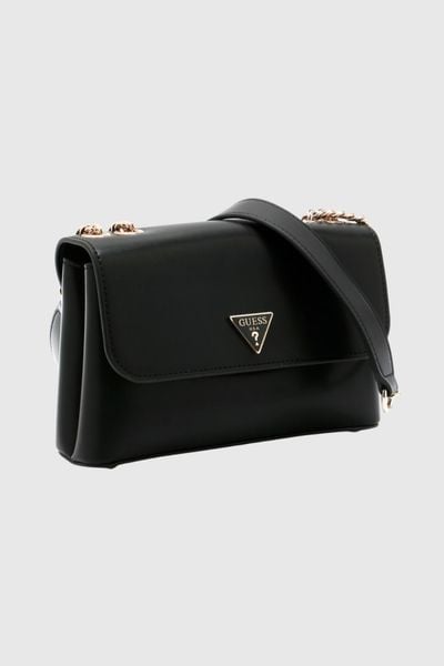 Czarna torebka damska marki Guess, wykonana ze skóry ekologicznej. Posiada pasek bez regulacji długości, jedną dużą komorę z trzema kieszeniami wsuwanymi i jedną zasuwaną na zamek oraz dodatkową komorę zewnętrzną zamykaną na magnes. Wyposażona w nóżki ochronne i worek przeciwkurzowy.