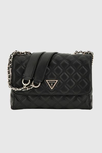 Czarna torebka damska marki Guess, wykonana ze skóry ekologicznej. Zamykana na klapkę z magnesem, posiada dwie komory wewnętrzne, kieszeń na zamek i sześć miejsc na karty. Z tyłu dodatkowa kieszeń zamykana na suwak. Możliwość noszenia na krótkim lub długim pasku. W zestawie worek przeciwkurzowy.