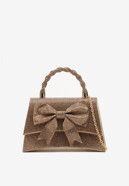 Złota Torebka Kopertówka Ozdobiona Cyrkoniami i Kokardą Deolire