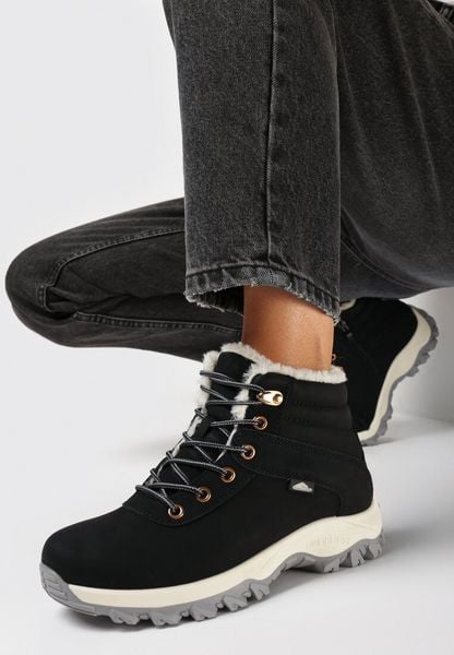 Czarne Sznurowane Traperki na Płaskiej Podeszwie Wyścielone Futerkiem Magsira