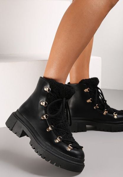 Czarne Sznurowane Traperki na Płaskiej Podeszwie Wyścielone Futerkiem Magsira